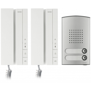 Kit citofonico Due Fili Plus contenente: 1 unità elettronica audio 40131, 1 Placca audio bifamiliare 40142, scatola da incasso 1 modulo 91K1, 2 citofoni cornetta Voxie per sistema Due Fili Plus con 2 pulsanti 40540, 1 alimentatore 40100